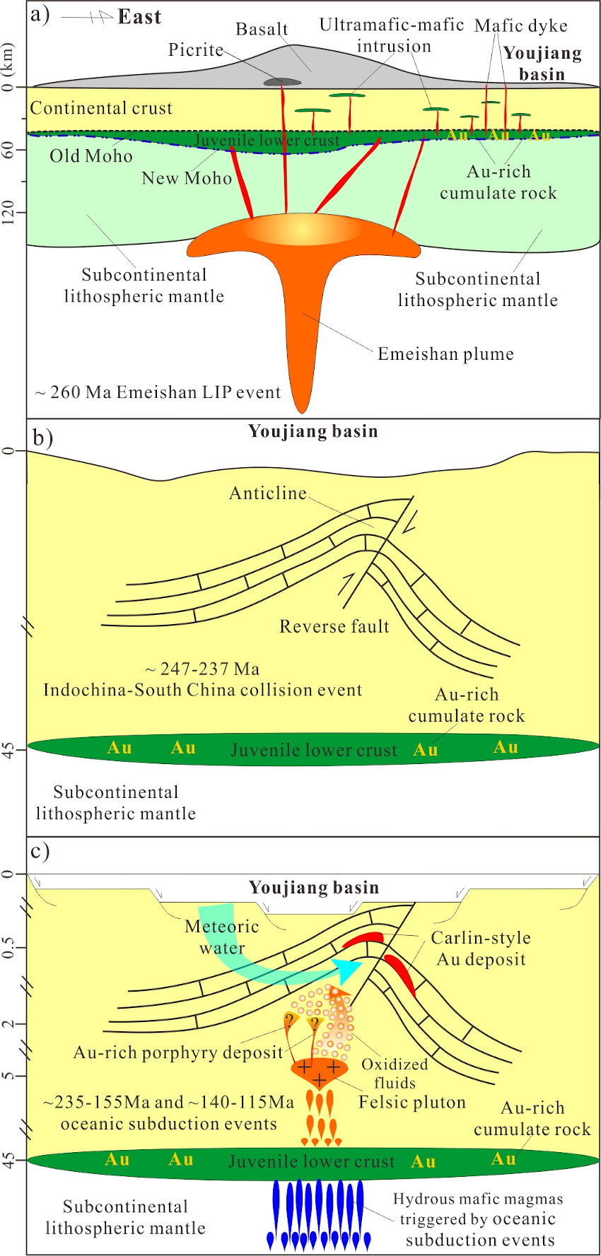 In conjunction with the geological framework in the Youjiang basin, we propose the following model for the formation and remobilization of Au-rich crustal magmatic underplate. (i) The primary Emeishan plume-derived magmas (~260 Ma), underwent high degrees of fractional crystallization, and generated massive Au-rich cumulate rocks at the base of the crust beneath the basin. (ii) The favorable ore-controlling systems, reverse fault on the flank of anticline (dome) or anticline (dome), were formed during the Indochina-China continental collision event (~247-237 Ma). (iii) The back-arc extensions and oxidized fluids associated with multiple oceanic subduction events (~ 235-155 Ma and ~140-115 Ma) triggered the melting of enriched juvenile lower crust, and contributed to the formation of Au-rich felsic magmas by oxidized fluids into the upper crust. (iv) The Au-rich magmatic fluids were released from felsic plutons, transported into shallow crust, mixed with meteoric water and ultimately precipitated within the favorable ore-controlling systems generated by continental collision event (Fig. 5).
