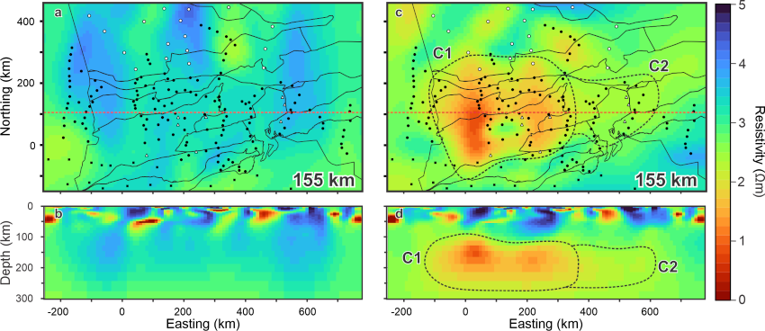 Depth slices and E-W cross-sections through the 3D anisotropic resistivity model are shown in Figure 2. At crustal depths the anisotropic model is approximately isotropic (ρx≅ρy) with similar resistivities and geometries to that of the original isotropic model24, and so are not shown nor discussed here. The lithospheric mantle of the SW Superior is characterized by moderate to high degrees of electrical anisotropy, with low and high resistivities along the N-S and E-W orientations, respectively. Depths of 100–250 km are generally resistive (>1000 Ω·m) along the E-W axis (ρy)throughout the model (Fig. 2a). Resistivities along the N-S axis (ρx) are considerably lower; a large conductive body, C1, (ρxof 10–100 Ω·m) extends from the western edge of the craton to just west of the Nipigon Embayment (Fig. 2b). The region defined by C1 has a corresponding anisotropic ratio (defined as ) of 10–100. Anisotropic ratios decrease to ~10 within C2; in this region, ρy remains relatively high (>1,000 Ω·m) while ρx increases to 100–300 Ω·m (C2). The top of the anisotropic layer varies, but on average is at a depth of 100–120 km. Above this depth, the uppermost mantle of the SW Superior is moderately resistive (ρx, ρy >500 Ω·m), with geometries that largely reflect smearing / smoothing of lower crustal structures due to the inability of MT data to image directly beneath highly conductive bodies27.