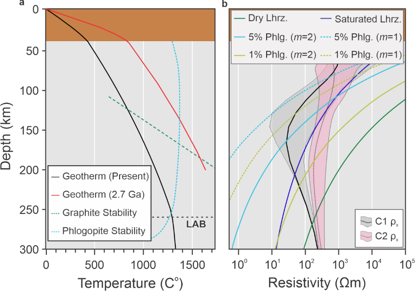 Figure 3: a) Approximate geothermal conditions at present-day (black line) and at 2700 Ma (red line; from ref. 54) overlaid by the stability fields of graphite and phlogopite. Black dashed line indicates the LAB depth estimated by this geotherm. b) Volume-averaged resistivity-depth profiles within the C1 and C2 anomalies overlaid by calculated resistivity-depth profiles for lherzolite (Lhrz.) with varying water content, phlogopite (Phlg.) content, and phlogopite interconnectivity (m=1 is perfectly connected, m=2 is partially connected).