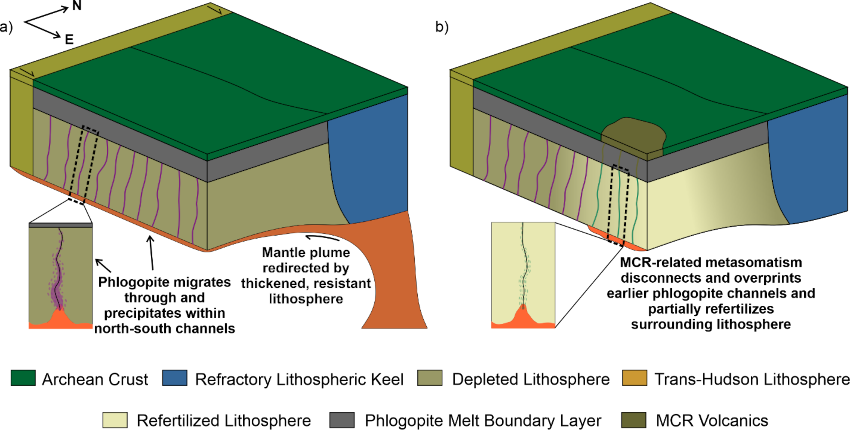 Figure 4: Schematic diagram illustrating the proposed mechanism of emplacement and structure of the metasomatized channels imaged within the lithosphere of the western Superior Craton. a) A ca. 1.9 Ga mantle plume impinges along the thickened, depleted lithosphere which comprises the northern cratonic core and is deflected southward. Pooling of melts at the base of the LAB results in gradual percolation of metasomatic fluids into the lithosphere forming phlogopite, possibly channeled into N-S weak zones which formed as a result of E-W compression during the Trans-Hudson Orogen. b) Subsequent melting and magmatism related to the ca. 1.1 Ga mid-continent rift overprints the phlogopite within the N-S channels and refertilizing the surrounding lithosphere.