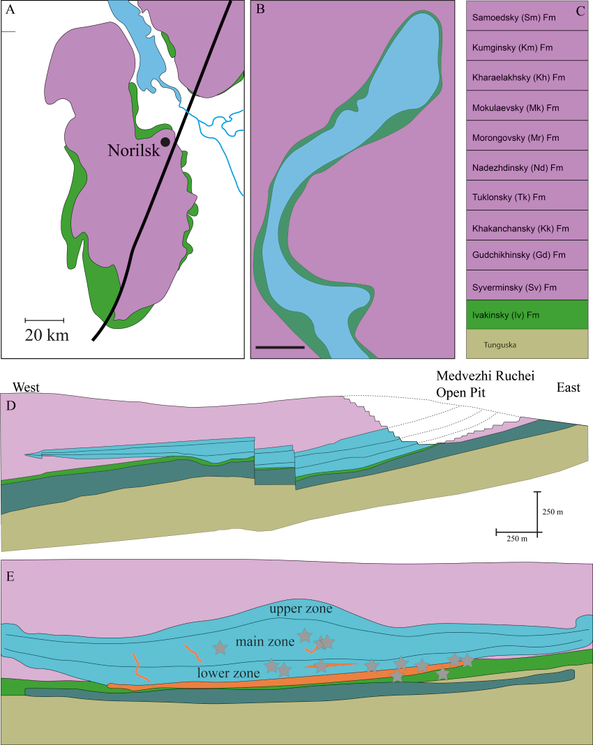 The Ni–Cu–PGE magmatic sulfide deposits of the Norilsk–Talnakh camp are associated with the Siberian Trap Large Igneous Province (ST-LIP) (see Barnes et al., 2020, and references therein). The Norilsk 1 deposit formed at ~252–250 Ma and is hosted at the stratigraphic boundary between the terrestrial Tunguska sediments and the Late Permian Ivakinsky Formation (for more details on ST-LIP geology see Fedorenko et al., 1996).