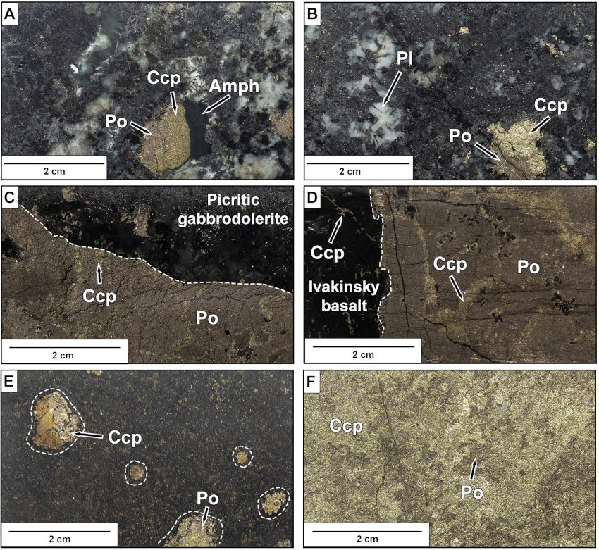 Figure 2. Photographs of representative samples from this study. (A) Taxitic gabbrodolerites (N-05-18) with a differentiated sulfide globule and an amphibole-rich region adjacent to the droplet (“cap”). (B) Differentiated sulfide bleb in a taxitic gabbrodolerite sample (N-04-18) with plagioclase segregations. (C) Contact of pyrrhotite-rich massive sulfide (N-07-18) and olivine-bearing gabbrodolerite (N-01–18) containing disseminated sulfides. (D) Contact of the Ivakinsky basalts and pyrrhotite-rich massive sulfide (N-12-18). (E) Copper-rich mineralization within the Ivakinsky Formation (often referred to as “cuprous”) containing blebs that are morphologically similar to those within the intrusion (N-14-18). (F) Massive chalcopyrite–pyrrhotite vein in the lower zone of the Norilsk 1 deposit (N-08-18).