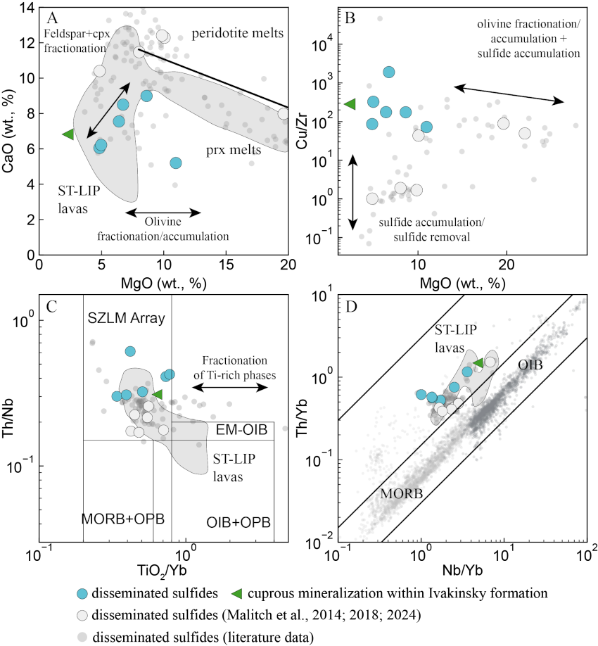 Figure 3. (A) MgO–CaO plot, (B) MgO–Cu/Zr plot, (C) TiO2/Yb–Th/Nb plot, and (D) Nb/Yb–Th/Yb plot for disseminated sulfide ores of the Norilsk 1 deposit. Gray dots represent the compositions of the Norilsk 1 intrusive rocks (from Hawkesworth et al. (1995), Czamanske et al. (1998), Malitch et al. (2018) and Chayka et al. (2023)). White circles are data from Malitch et al. (2018). Gray field in (A) is the composition of ST-LIP lavas (Lightfoot et al., 1990; Lightfoot et al., 1994). Small light gray points in (D) are MORB from Gale et al. (2013). Dark-gray points in (D) are OIB data (Hawaiian Islands) from the GEOROC database (https://georoc.eu/; accessed on May 18, 2022).