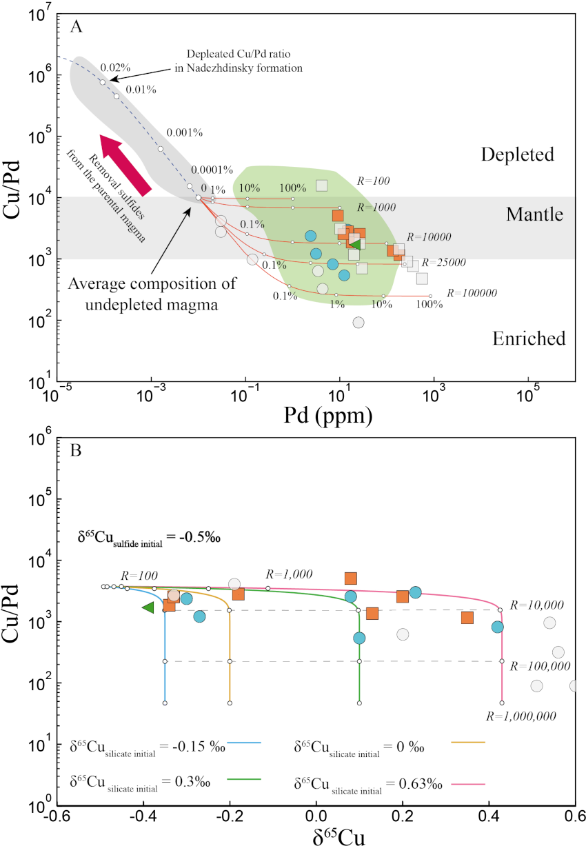 Figure 4. Bivariate diagram showing the modeled variations in Cu/Pd ratios and Pd contents as a function of R factor and sulfide liquid removal. The orange and blue curves are the R factor and sulfide removal models, respectively. The green field is literature data from the Norilsk 1 deposit (Duran et al., 2017). The gray field is the composition of the Nadezhdinsky Formation (Lightfoot and Keays, 2005). The average composition of undepleted magma is from Duran et al. (2017). (B)Diagram showing the modeled variations in δ65Cu values and Cu/Pd ratios as a function of R factor. The colored lines represent different initial δ65Cu values for the undepleted silicate melt that fluxed through the Norilsk system. White dots are data from Malitch et al. (2014; 2018; 2024).