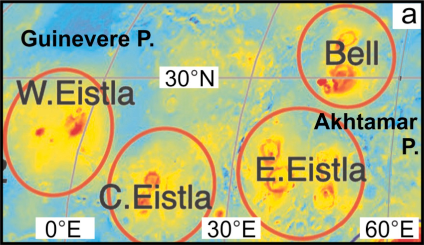 Figure 1. Eistla Regio (Western, Central and Eastern Eistla) and Bell Regio plume centers located on altimetry map (with the red to blue spectrum corresponding to high low topography). Extracted and modified from Hansen (2018).
