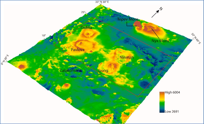 Figure 2. Topography of Eastern Eistla Regio and surrounding region (from NASA Magellan altimetry data). Note that Tepev Mons and Nyx Mons belong to a separate plume center (Bell Regio). Also note that Calakomana Corona has a much flatter topography and is inferred to be older and unrelated to the Eastern Eistla Regio plume.