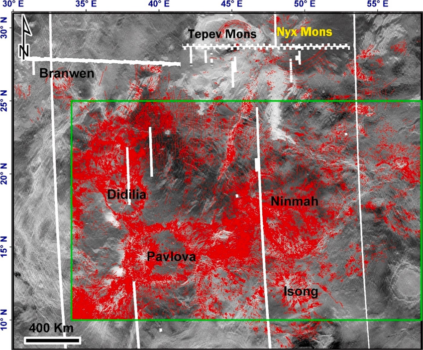 Eistla Regio on Venus comprises three east–west–aligned regional topographic highs interpreted as products of mantle plume activity (e.g., Stofan et al., 1995; Senske et al., 1992; Ernst et al., 2007) (Fig. 1). Western Eistla generally peaks between 0.5 and 1.0 km, with the Sif and Gula mountains reaching elevations of 2 to 3 km. Central Eistla Regio rises to 1 km, this elevation being dominated by Irnini Mons/Sappho Patera and Anala Mons. Eastern Eistla is dominated by Ninmah, Isong, Pavlova and Didilia coronae. We selected Eastern Eistla Regio as the focus of this research (Hasanaine et al., 2026) in order to investigate the setting and age relationships of four well-developed similar-sized coronae above a single large mantle plume (Fig. 2).