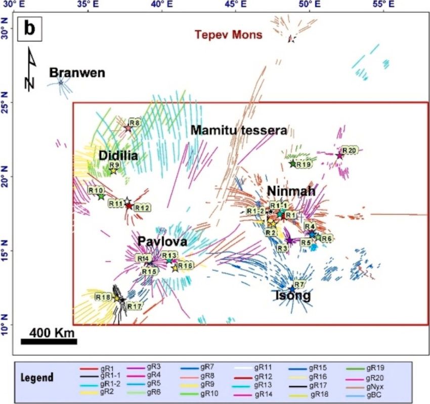 We mapped 70,000 extensional lineaments (grabens and fissures) (Fig. 3) and grouped them into radiating, circumferential and linear systems, which we interpreted as surface expressions of mafic dyke swarms (cf., Grosfils and Head, 1994; Ernst et al., 2003; Buchan and Ernst, 2021; El Bilali et al., 2023). Radiating and circumferential dyke swarms are closely associated with the four coronae and their underlying plumes or diapirs (Fig. 4). Twenty radiating systems are identified, including eight with radii >400 km and four >1000 km. Ninmah, Pavlova, and Didilia each host multiple radiating centers, whereas Isong exhibits a single center (Fig. 4). Circumferential swarms occur at Ninmah and Isong. Seven linear dyke swarms are also recognized, of which at least three likely originated by lateral emplacement from magmatic centers outside the study area (for full details see Hasanaine et al., 2026).