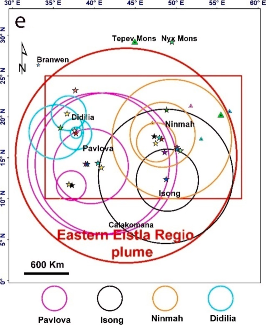 Figure 5. Sizes of all the plumes associated with the four different coronae (Didilia, Pavlova, Ninmah, and Isong). The sizes of the multiple plume heads associated with each corona were estimated from individual radiating swarms (Fig. 4) from the distance at which they deviate from radiality (e.g,. Hasanaine et al., 2026; see also El Bilali and Ernst, 2024). All of the local plume head sizes are located within the overall 1300 km radius of the Eastern Eistla Regio plume head (outer red circle) and presumably represent more local upwelling within the overall large plume (Fig. 7). Note that Tepev Mons and Nyx Mons belong to the separate Bell Regio plume, and that the Calakomana Corona is older and unrelated to the Eastern Eistla Regio plume.
