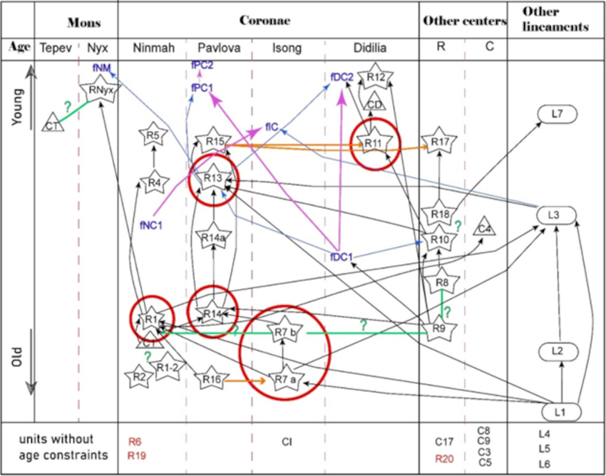 Relative chronology based on cross-cutting relationships and dyke trend changes indicates overlapping magmatic activity among the coronae, with principal radiating swarm development progressing from Isong to Ninmah, Pavlova, and Didilia. Pavlova also records late-stage activity (Fig. 6).