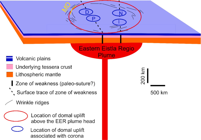 Figure 7. Model of Eastern Eistla Regio mantle plume spawning four coronae along two approximately parallel zones of weakness in the lithospheric mantle that are recognized on the basis of Bouguer gravity anomalies linking Didilia and Pavlova coronae and linking Ninmah and Isong coronae (see Hasanaine et al., 2026 for details). MD = Metelitsa Dorsa.